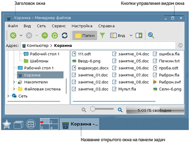 Все общение пользователя с Astra Linux происходит посредством так называемых окон. Рассмотрим правила работы с окнами на примере пиктограммы «Корзина», которая постоянно присутствует на рабочем столе. Корзина – это специально выделенная память (папка) для временного хранения удаленной информации.