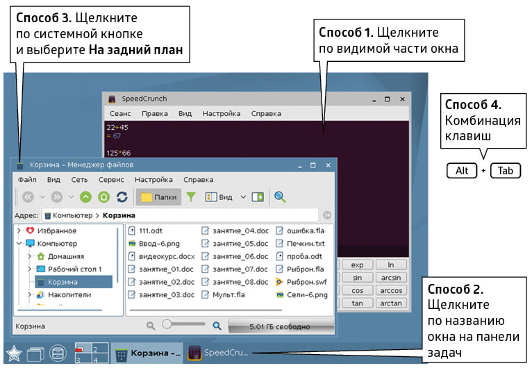 Сейчас на вашем экране открыты два окна: Корзина и Калькулятор (рис. 1.10). Одно из них частично или полностью перекрывает другое. Как перевести на первый план то окно, которое находится на заднем плане?