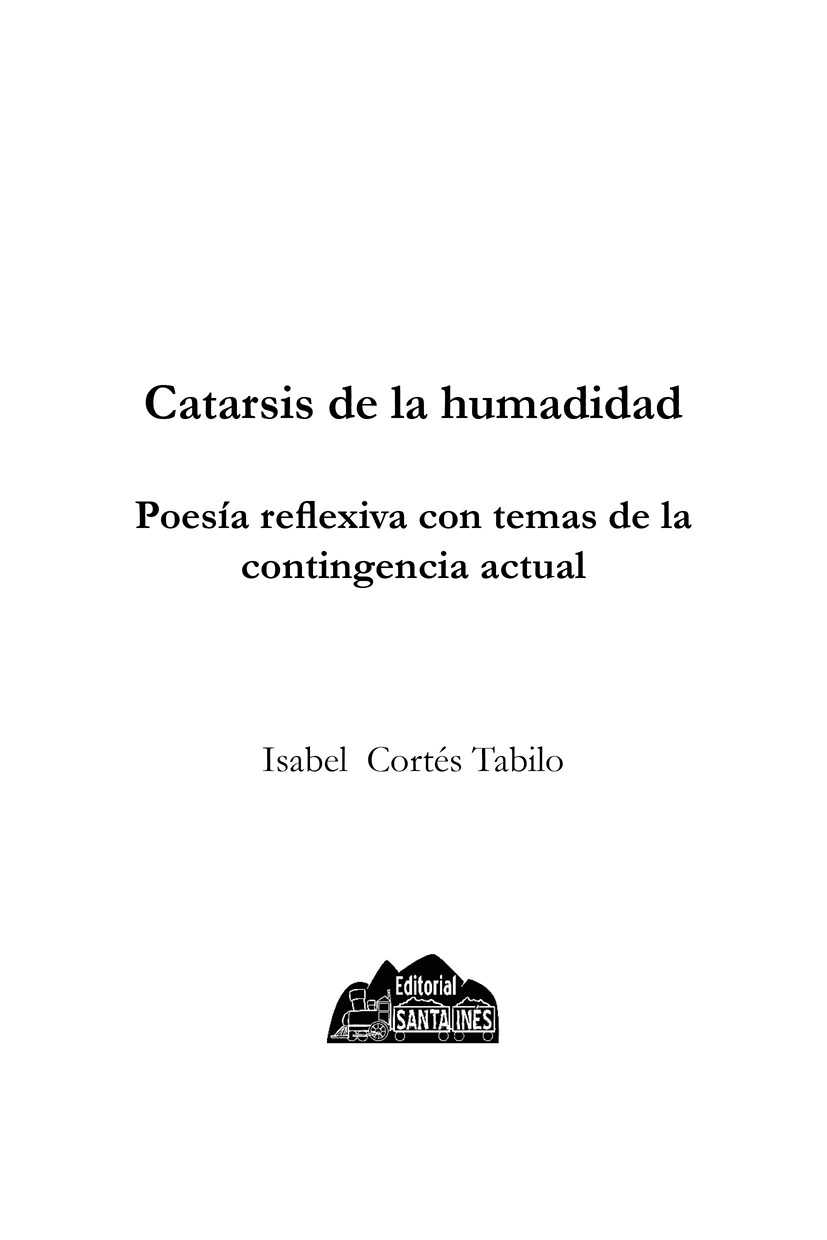 «Catarsis de la humanidad: Poesía reflexiva con temas de la contingencia actual» Poesía Chilena, 186 páginas Segunda edición: febrero del 2021 Edita y distribuye Editorial Santa Inés Santa Inés 2430, La Campiña de Nos, San Bernardo de Chile +56 9 42745447 Instagram: santaines editorial Facebook: Editorial Santa Inés librosdelaeditorial@gmail.com www.editorialsantaines.cl Registro de Propiedad Intelectual N° 156.414 ISBN: 9789566107057 eISBN: 9789566107064 Edición General: Patricia González Edición Gráfica y Diseño de Portada: Benjamín Vergara Edición de Estilo y Ortografía: Tania Guzmán Edición electrónica: Sergio Cruz Impreso en Chile / Printed in Chile Derechos Reservados