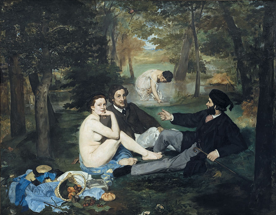 Картина сразу привлекла всеобщее внимание сюжетом: обнаженная женщина в компании молодых людей на загородном пикнике. На заднем плане в воде изображена еще одна женщина, но уже в платье. Возмутителем общественного спокойствия стала именно обнаженная натура. Обнаженных героинь и прежде зачастую изображали на картинах. Но идеализированно, в виде мифологических, аллегорических персонажей. А здесь – разнузданная «уличная девка» беззастенчиво и вызывающе смотрит на зрителя. Что же так возмутило публику? Что женщина обнажена? Или что она находится в компании одетых мужчин? Необычность работы в первую очередь была в том, что женщина была изображена без намека на какую бы то ни было идеализацию: нет привычных наяд, дриад и ангелочков. Тут же ее небрежно брошенная одежда и завалившаяся набок корзинка со снедью. Несомненно, картина рассматривалось как пощечина общественной морали. К примеру, у Тициана рыцарь в доспехах поддерживает совершенно обнаженную героиню, спасая ее – подобного рода сюжеты во множестве писали классики изобразительного искусства. А на этой работе современно одетые мужчины о чем-то оживленно беседуют, словно и нет рядом обнаженной дамы.