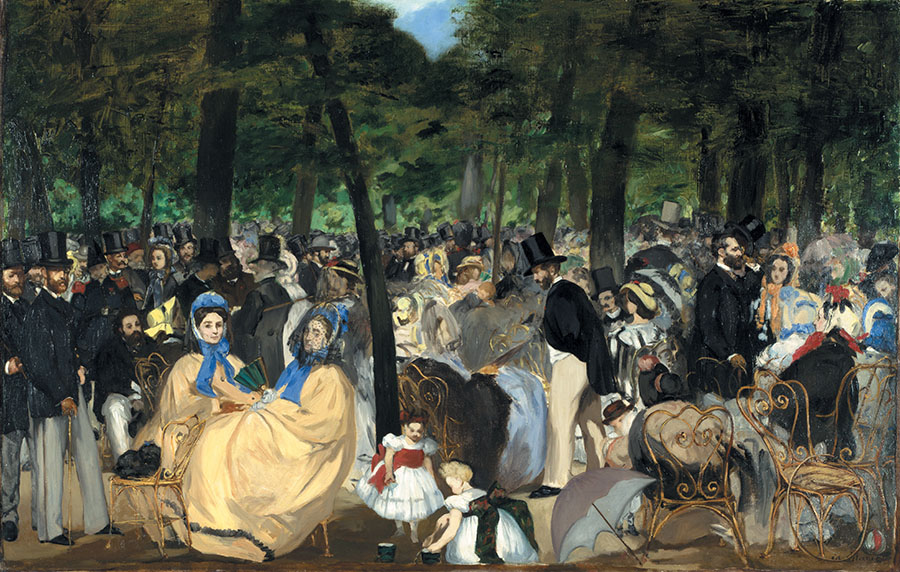 Еще одна из ранних импрессионистических картин художника, также всколыхнувшая общество, – «Музыка в саду Тюильри». Прогуливаясь по Парижу, Мане и Бодлер забредали порой и в парк Тюильри. В ту пору там часто проводились концерты, где зрители, свободно располагаясь перед сценой, отдыхали, общались и слушали музыку. Мане избрал ракурс зрения в этом полотне со стороны сцены, на которой располагался оркестр. Взору зрителя предстают собравшиеся на концерт представители парижского общества во всем его многообразии.