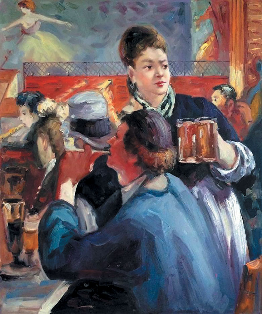 Нечто подобное мы видим в картине «За столиком в варьете». В чем особенность этой картины? Обращает на себя внимание официантка: она композиционно связана с человеком, которому подносит пиво, однако смотрит в сторону, противоположную от клиента. Сюжет демонстрирует то, что мы часто наблюдаем в реальности, когда человек, занимаясь одним делом, на какое-то мгновение отвлекается. Казалось бы, она должна угодливо наклониться к посетителю, но она смотрит куда-то вдаль, что-то сиюминутное привлекло ее внимание. Сценка написана в диссонансе с повествовательной логикой событий – так Мане отображает реалистичность происходящего. По всей видимости, ее кто-то окликнул или что-то неожиданно заинтересовало, и она отвлеклась. Но художник композиционно объединяет движение персонажей изобразительным приемом. Мы видим пластичные, округлые очертания ее спины и тела клиента, которые их объединяют. Мане запечатлел ситуацию, уловил мгновение и придал ему своеобразную поэтическую форму. Цветовое решение органично дополняет и усиливает это впечатление. Оранжевое сияние кружек, синяя рубашка мужчины, блузка официантки, вертикали и горизонтали пятен теплых оттенков – всё вместе наделяет гармонией и соединяет этот сюжет в одно целое. Диагонали связываются и переводят взгляд зрителя вглубь, позволяя рассмотреть фигурку танцовщицы на сцене. Все эти связующие линии делают картину плотной и структурно слепленной.