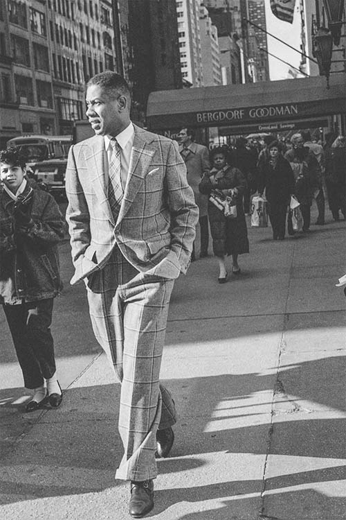 Sauntering down Fifth Avenue in a Savile Row Huntsman bespoke suit, in December 1986, I believe.