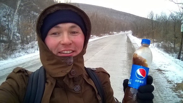 …В Китае есть снег? не так я себе представлял их зиму. Да еще и холодно как в России. Два часа поиска велосипеда в Суйфэньхэ не дали результата и меня потянуло на приключения. Я купил черные очки. Первая попытка угнать чей-то велик провалилась: выскочил мужик и начал орать, а во второй раз я вспомнил про действующую казнь, и поэтому просто пошел на трассу ловить попутку. В итоге я прошел по снежным сопкам и деревенским тропинкам 15 км, пока не захромал. В руке я нес пепси в пластиковой бутылке- она просто-напросто превратилась в лед.