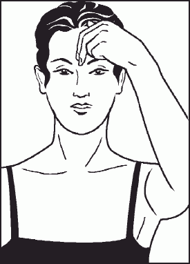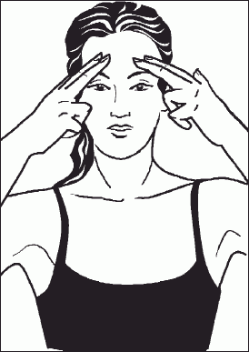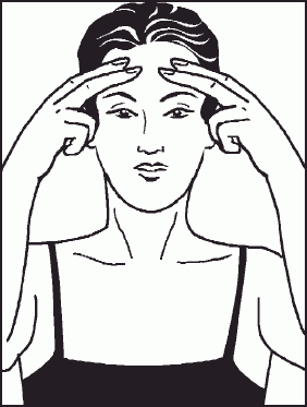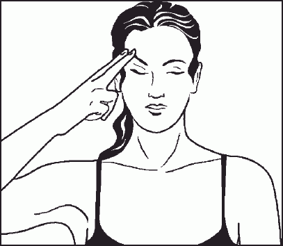 Расположите по два пальца на лбу на некотором расстоянии друг от друга. Плавно и медленно сводите пальцы вместе. Почувствуйте тепло и расслабление в области лба.