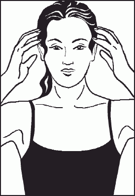 Расположите руки прямо над ушами по обе стороны головы. С помощью всех пальцев, кроме большого помассируйте височные мышцы.