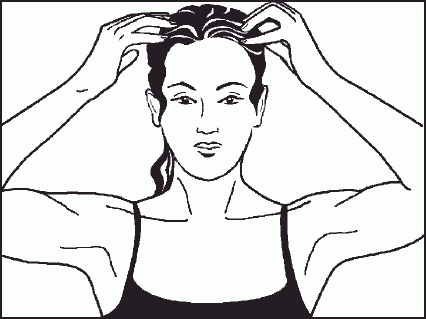 Плотно прижмите кончики пальцев к волосяной части головы. Помассируйте кожу круговыми движениями. Снимая напряжение в этой области вы предотвращаете появление морщинок на лбу.