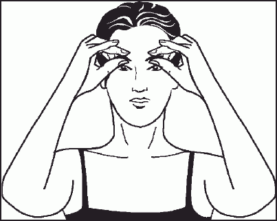 Положите указательные пальцы симметрично середине лба. Медленным движением двигайте пальцы вверх-вниз, как будто «пилите» лоб. Постепенно сдвигайте и раздвигайте их к краям лба. Повторите от 5 до 10 раз.