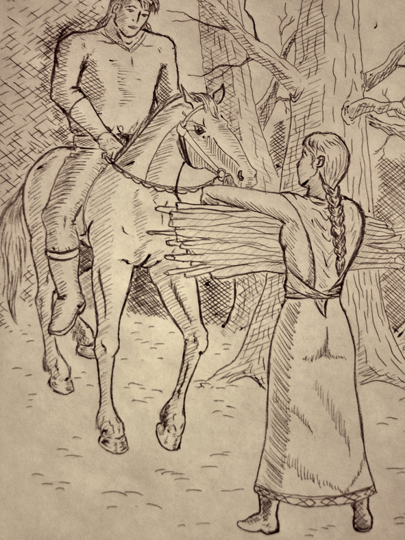 Она снова кивнула, но уже более уверенно. Подхватив её хворост, Гейр положил его поперёк седла своего коня, и, взобравшись наверх, помог девушке сесть позади себя.