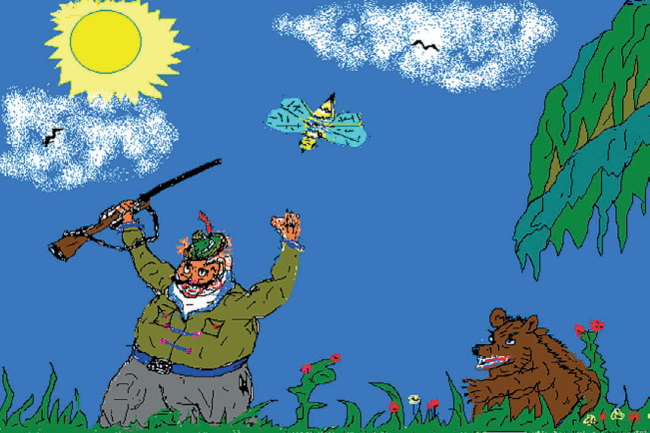 Однажды медведь гулял по лесу, кушал малину, собирал цветочки. Он хотел пойти в гости к пчёлке и подарить ей большой красивый букет. День был жаркий, и медведь решил немного отдохнуть в тенёчке. Прилёг он под большим деревом да и задремал. В ту пору по лесу проходил охотник; смотрит: медведь под деревом лежит. Снял он с плеча ружьё и начал прицеливаться, а сам думает уже, какую тёплую шубу сошьёт из медвежьей шкуры.