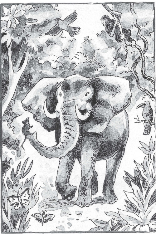 А хобот у слона изнутри – самое нежное место. Представьте себе, если к вам в нос заберётся муравей да начнёт кусать и щекотать. От этого слон стал страшно кричать, трясти головой и колотить хоботом о землю – всё было напрасно. Наконец он так устал, что без сил повалился на землю. Он был не в силах даже поговорить, только жалобно охал.