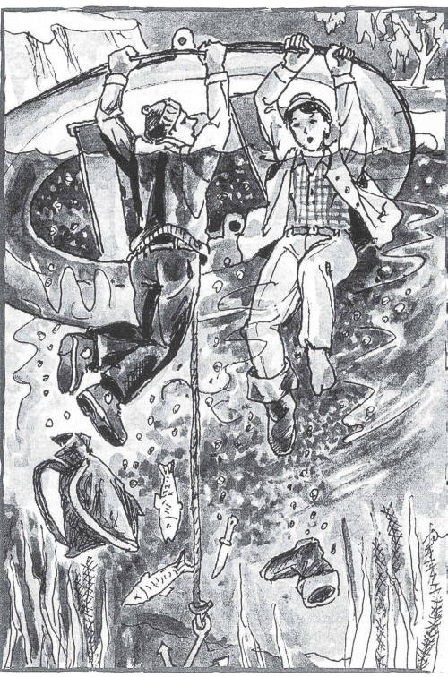 Выбравшись из камышей, я увидел, что лодка как-то странно задрала один борт кверху, а другой скрылся под водой. По озеру плавали наши рыбацкие трофеи, рюкзак, удочки и ещё какие-то мелочи. Оба рыбака неуклюже барахтались в воде, держась за лодку. И, хотя до берега было рукой подать, плыть в резиновых сапогах и одежде – всё-таки дело непростое. Лодка вертелась на месте и никак не хотела плыть вперёд.