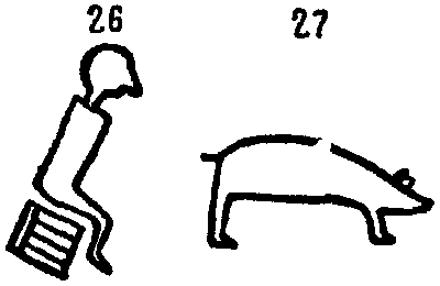[На этом рисунке опять изображен сидящий на земле На-на-буш, каким он показан на рис. 3. Это означает, что все участники культового обряда, который длится почти целую ночь, должны неподвижно сидеть на своем месте и внимательно слушать певца, тоже соблюдающего это правило. По окончании песнопения певец встает и, не обмолвившись с присутствующими ни единым словом, покидает палатку.]