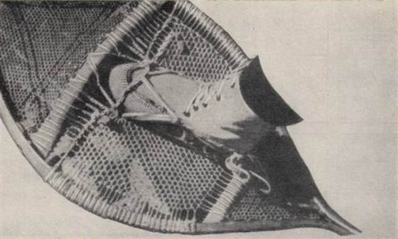 Индейские лыжи-ракетки, по форме напоминающие ракетку, служат не для скольжения, а для хождения по глубокому снегу; их надевают, чтобы не проваливаться в сугробы. У северных племен лыжи приобрели такое важное значение, что можно говорить о своеобразной «лыжной культуре». Сделанная из кедра рама лыж обтягивается сеткой, искусно сплетенной из тонких кожаных полос. – Прим. ред.