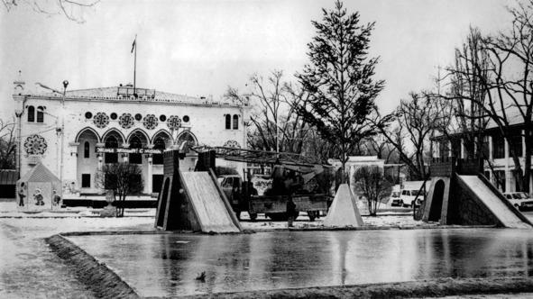 Новогодний праздник – праздник вдвойне. Ему предшествовало установление новогодней ёлки на площади возле фонтана. Не той, что растёт в лесу, а сборной: в металлическую трубу длиной десять-пятнадцать метров, с врезанными в неё патрубками, вставлялись небольшие ёлочки или ветки ели. Ёлка украшалась игрушками, серпантином и прочей мишурой, включая гирлянды с разноцветными огнями. Так стояла она, сверкая и поблёскивая, почти до конца января. Вокруг ёлки заливали каток.
