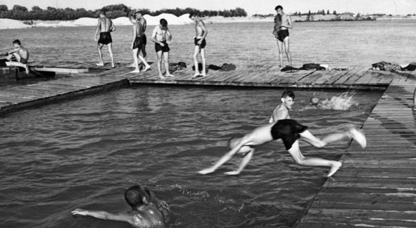 В то время на пляже устраивались самые разные соревнования: по перетягиванию каната, поднятию гирь, лазанью по шесту, игре в волейбол. Любители футбола гоняли мяч на спортивной площадке заводского парка, расположенной рядом. И все же – самыми зрелищными здесь всегда были игры на воде. На плоту, выполненном в виде бассейна с вышкой, заводчане учили своих детей плавать. Подростки, не без риска, подныривали под понтоны, играли таким образом в «чур меня». Ну а те, что постарше, взбирались на вышку и устраивали показательные выступления по прыжкам с высоты в воду. О ходе соревнований извещал репродуктор. Из него же отдыхающие узнавали о новостях в стране, слушали трансляцию популярного в те годы концерта по заявкам радиослушателей.