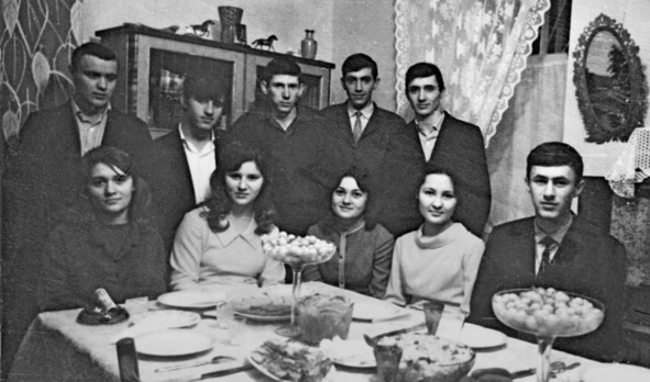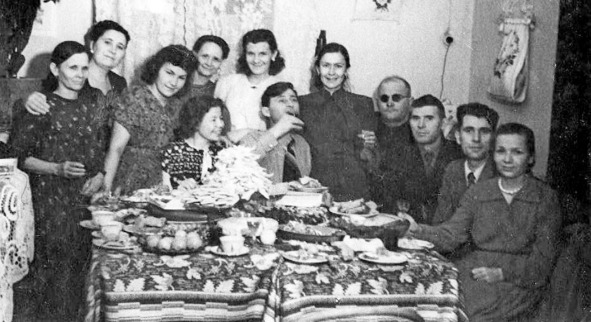 Коллектив ЖКО ГНПЗ гуляет у своего начальника К. П. Сладкова (третий справа; его супруга Мария – вторая слева) 1955