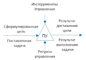 Процесс управления представляет собой воздействие субъекта управления на объект управления при помощи инструментов и ресурсов управления для выполнения задачи по изменению поступающего продукта в переработанный продукт в рамках операционного процесса.