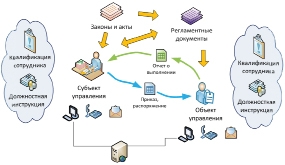 На входе процесса управления – поставленная задача (план, распоряжение, указание и др.), которая указывает объекту управления, что надо делать, а на выходе – результат выполнения задачи (плана, распоряжения, указания и др.). Как надо делать, указывается в регламентных документах. При этом субъект управления должен регулярно получать от объекта управления информацию о ходе выполнения операционного процесса, на основании которой субъект управления может осуществлять корректировку выполнения операционного процесса посредством изменения/дополнения/корректировки задачи, указания или распоряжения объекту управления.