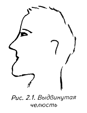 ВТЯНУТАЯ нижняя челюсть также «вылавливается» в профиль. При визуальном боковом сканировании лица создается впечатление, что верхняя губа и носовой желобок как бы нависают надо ртом (см. рис. 2.2). По-видимому, прикус зубов также изменяется, что вы можете сами у себя без труда проконтролировать.