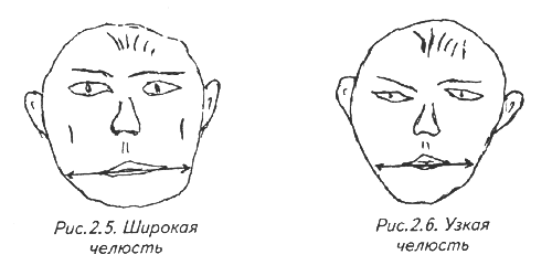ДИАГНОСТИЧЕСКАЯ ФИЗИОМЕТРИКА. Как определить ширину челюсти? Проведите поперечную линию на уровне середины нижней губы, если губы толстые или отвислые, или прямо под нижней губой, если они тонкие. Таким образом вы достаточно точно определите ширину нижней челюсти. Чисто визуальный метод «по желвакам» (т. е. нижнее место прикрепления жевательной мышцы) гораздо менее прогностичен, так как связка этой мышцы крепится к нижней челюсти гораздо ниже. С «длиной» проблем еще меньше – за начальную точку отсчета возьмите середину опять-таки, нижней губы и опустите перпендикулярную линию до нижней точки подбородка.