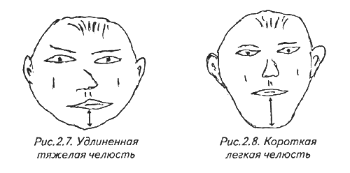 Теперь поговорим о второй качественной характеристике челюсти – ее длине. Еще удлиненную челюсть можно назвать тяжелой, а короткую – легкой. Ведь по сути, так оно и есть. Схематические рисунки 2.7 и 2.8 иллюстрируют вышесказанное. Понятно, что легкая челюсть более подвижная и динамичная. Отсюда и соответствующий психологический портрет индивида: мобильность, легкость, оперативность и подвижность. То есть, как минимум способность быстро «включаться» и точно так же без пролонгированной паузы «переключаться». Добавим к этому еще и высокую лабильность нервных процессов, или, по-другому, – быстроту реакции на внезапно возникший сигнал. То, что мы называем «схватываемостью на лету». Недостаток тяжеловесности: легкая челюсть как раз и компенсирует мгновенным реагированием и безинерционной переключаемостью.