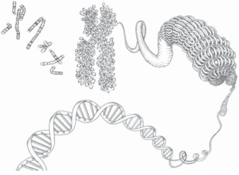 Как уже говорилось, молекулы ДНК, содержащиеся во всех хромосомах одной клетки человека, имеют общую длину около 2 метров. Это в среднем в миллион раз больше, чем диаметр клеточного ядра, составляющий порядка микрометра. Как же умещаются столь гигантские молекулы в таком маленьком ядре? Изучение структуры хромосом позволило ответить на этот вопрос. Оказывается, в ядре осуществляется «насильственная» упаковка молекул ДНК. Это достигается с помощью специальных механизмов, обеспечивающих изгибание двойной спирали ДНК. Существует несколько уровней «компактизации» ДНК в клетке (рис. 11).