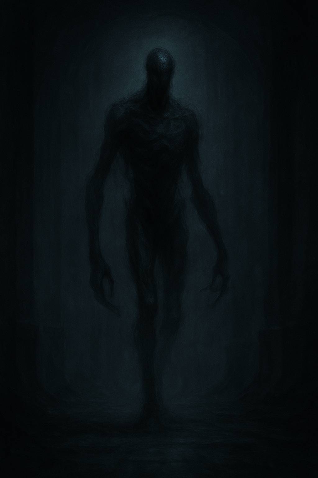 Из тёмного угла зала стала вырисовываться фигура – высокая, неестественно вытянутая по вертикали, и очертания её были смазанными, словно сквозь кривое стекло. Сначала видно было только смутную тень, затем постепенно прорисовались более чёткие контуры – массивные пропорции, длинные конечности. Не было никаких узнаваемых деталей вроде лица или одежды – казалось, это существо состояло из сплошной тьмы, которая шевелилась внутри него, словно клубок змей.