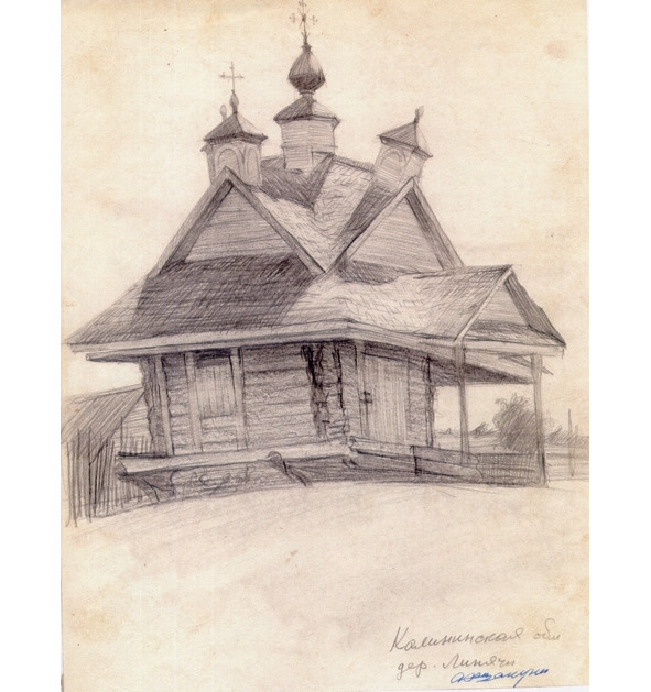 Часовня в д. Липячи (не сохранилась). Художник Завен Аршакуни (карандаш).