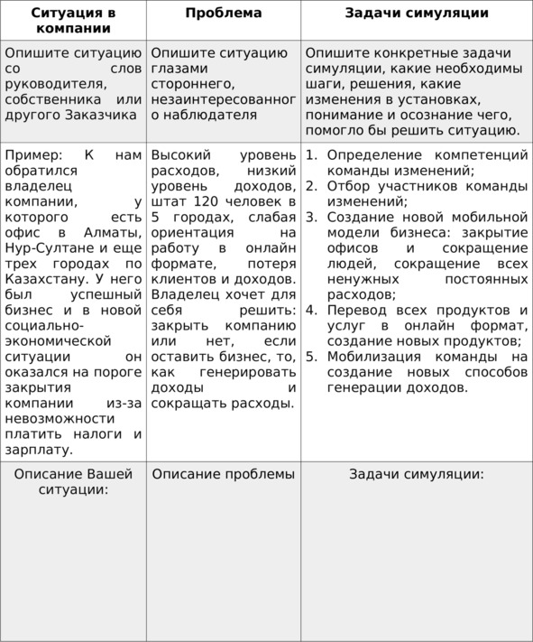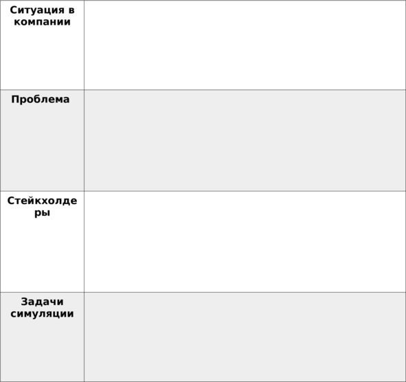 – сформулируйте задачи бизнес-симуляции: что должны осознать, понять стейкхолдеры, какие решения принять, как должны действовать, чтобы проблема была решена, то есть какие изменения в поведении и мышлении должна вызвать симуляция.