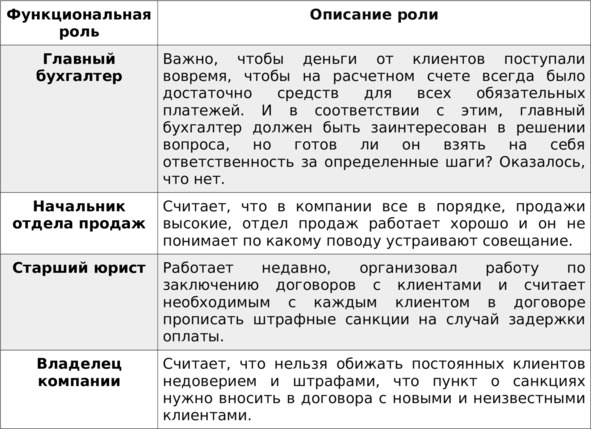 Компания занимается дистрибьюцией сельскохозяйственных удобрений и семян. Планы по продажам выполняются и перевыполняются, продавцы получают бонусы, а вот оборотных средств в компании не хватает, так как за поставленный товар клиенты не всегда рассчитываются вовремя. Для оплаты налогов и зарплаты, деньги приходилось собирать и выпрашивать у клиентов. Владельца эта ситуация не устраивала, и он решил обратиться к нам. Мы пообщались с каждым из стейкхолдеров и выяснили позицию, интересы и степень вовлеченности в решение проблемы. И в ходе ролевой игры решили собрать на совещание всех заинтересованных в данной ситуации лиц, чтобы выработать решения. На совещании будут присутствовать: главный бухгалтер, начальник отдела продаж, старший юрист компании и владелец. Задача для всех: выработать решение ситуации, которое бы устраивало всех. Но функциональные роли в симуляции, будут отличатся от их ролей в компании, то есть бухгалтер станет юристом, а юрист – возглавит отдел продаж. Таким образом, мы их «переобуем в тапочки другого отдела».