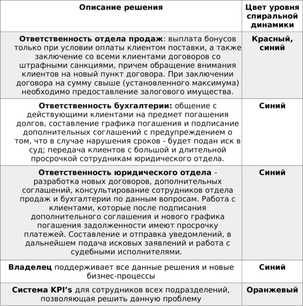 У нас в тоже время должен быть вариант идеального решения, он не так прост, как кажется на первый взгляд и очень зависит от уровня спиральной динамики, на котором находится корпоративная культура компании (автор теории Грейвз Клер Уильям, рекомендую почитать Фредерика Лалу http://biryuzovie.ru/stati/frederik-lalu-opisyvaya-organizacii-budushhego). Если принимать решения с точки зрения красного уровня: нужно выбивать деньги из клиентов, можно лишать бонуса продавцов, чьи клиенты не рассчитались, на синем – можно подавать иски в суд и так далее. Принятие решений таким образом в будущем грозит нам: потерей мотивации продавцов, потерей части клиентов и судебными издержками. Поэтому решение должно быть многоуровневое с разделением ответственности между всеми подразделениями компании: