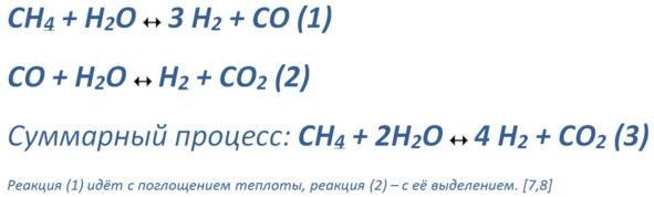 Предполагаю, что идут процессы сходные с процессами, которые уже активно используются в промышленности в так называемых процессах паровой конверсии метана (ПКМ) (см. Рис. 8). Где расщепляет метан и водяной пар на водород и моноксид углерода.