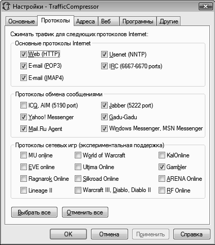 После загрузки значок TrafficCompressor помещается в область уведомлений. При наведении указателя на значок отображается состояние подключения к сжимающему серверу программы и количество сэкономленных мегабайт. Выбрав пункт меню Настройки, можно открыть окно настроек утилиты. На вкладке Протоколы данного окна в соответствующих областях можно указать, для каких протоколов следует сжимать трафик (рис. 1.6).