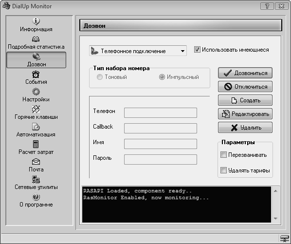 Детальную информацию по месяцам можно просмотреть в разделе Подробная статистика. Программа способна автоматически дозваниваться до провайдера по всем указанным соединениям. В разделе Дозвон можно задать все нужные параметры: номер телефона, логин, пароль и необходимость повторного дозвона при наличии обратного звонка (рис. 1.7). DialUp Monitor позволяет использовать имеющиеся в системе номера дозвона, а также добавлять и настраивать новые непосредственно в окне программы.