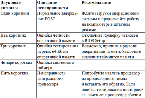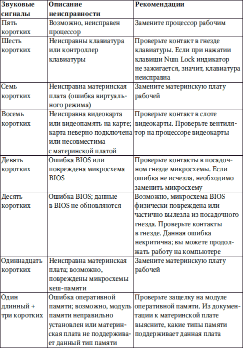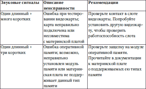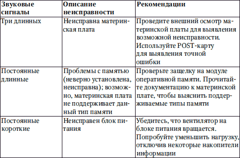 Если вы услышали последовательность коротких и длинных сигналов, обязательно посчитайте их количество и обратите внимание на длительность.[1] Подсчитав количество сигналов, найдите данное сочетание в таблице, соответствующей BIOS вашего компьютера, чтобы определить, что означает данный сигнал. В табл. 1.1–1.3 приведены основные варианты серий звуковых сигналов, характерные для BIOS разных производителей, а также краткие пояснения к ним.
