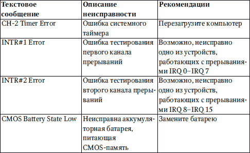• Звуковые сигналы. Каждой неисправности соответствует серия звуковых сигналов, которые выдает POST в ходе тестирования устройств. Звуковое оповещение обычно используется в самых критичных случаях, когда компьютер лишен возможности отображения текстовой информации. Звуковые сигналы могут применяться также параллельно с текстовыми сообщениями, и именно на звуковые сигналы в первую очередь необходимо ориентироваться при возникновении неисправности.