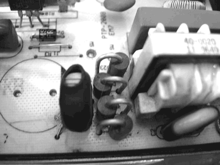 Сняв кожух, внимательно рассмотрите плату блока питания. Поскольку предохранитель устанавливается непосредственно за кабелем питания, то и искать его нужно там, где этот кабель припаян к печатной плате.