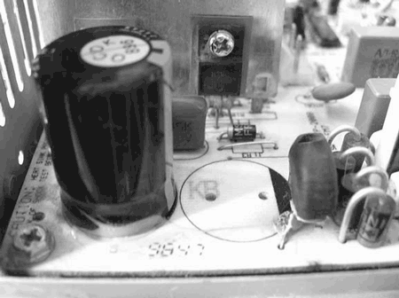 Высоковольтный фильтрЕсли проверка высоковольтного выпрямителя не дала результатов, следует проверить высоковольтный фильтр. В качестве высоковольтного фильтра выступает набор из нескольких электролитических конденсаторов большой емкости. Именно эти конденсаторы являются причиной выхода из строя блока питания, особенно если их количество слишком мало или электролитические характеристики далеки от нормы (рис. 1.4).