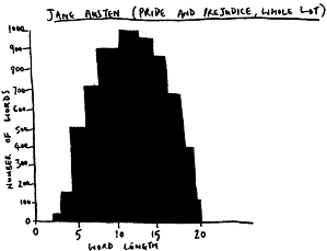 The four longest words used by Jane Austen in Pride and Prejudice have 16 or 17 characters. They are ‘superciliousness’, ‘communicativeness’, ‘disinterestedness’ and ‘misrepresentation’. But just looking at the longest words is not enough: we need to examine the distribution of word lengths over her entire vocabulary, as shown in the graph below: