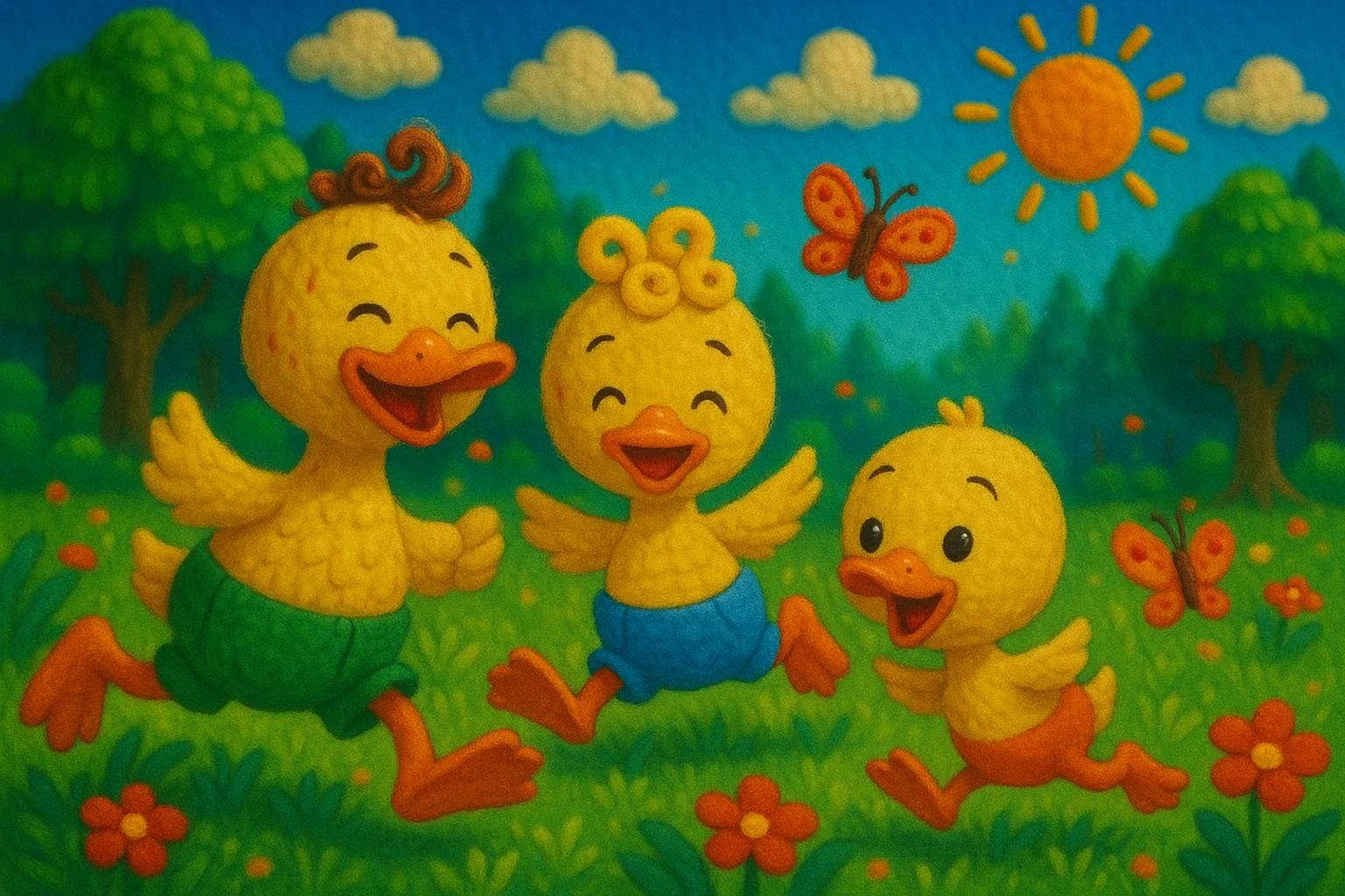 Рано утром, когда солнце только появилось на небе, в лесу у тихого пруда проснулись три маленьких утёнка – Кряк, Буль и Пух. Они весело крякали, прыгали по мягкой зелёной травке и гонялись за бабочками, которые порхали вокруг.