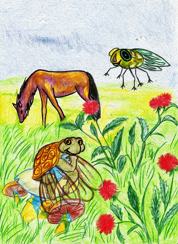 Наконец она устала и опустилась передохнуть на старый переросший гриб с плоской широкой шляпкой, который одиноко вырос в поле среди невысокой травы. Вокруг гриба на лугу паслись лошади, и Почи заметила, как злой овод кружит около одной из них, и очень больно кусает бедняжку в спину. Покусанная лошадь изо всех сил отмахивалась от овода хвостом, но достать его не могла, а овод от этого нападал на неё ещё злее.