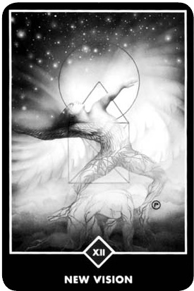 XII Аркан в колоде Ошо Дзен Таро называется Новый взгляд. В классических колодах Аркан носит имя Повешенный.