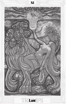 А пока он думал: ну хорошо, ну если Таро, то какая именно карта. То есть какая карта Таро может дать ключ к разгадке розовой тетрадки и к его, Шарманщика жизни, потому что он знал, что это одно и то же. Не всю же колоду здесь надо учитывать. Ну хорошо, начнем с главных арканов (картинок): какой тут может подойти? Шарманщик полез в карман куртки, висящей в шкафу кельи. Рукава были еще мокрыми от новогоднего снега. Он достал сигарету из пачки, собираясь воровато курнуть в окошко, и тут его осенило. Ведь если Таро «режется» пополам, на 47-ю и 48-ю страницы, и разгадка находится между «та» и «ро», то и арканы, то есть их количество, тоже, наверное, надо разделить пополам. Так-так. Там еще есть нулевая карта – джокер, шут, но она все равно считается и входит в состав этих двадцати двух главных арканов. Двадцать два надо разделить на два, и тогда ключ найдется между одиннадцатой картой и двенадцатой. А что изображает одиннадцатая карта? Этого он не помнил. С так и не зажженной сигаретой он спустился в холл, нашел телефон, кинул монетку и позвонил в Москву… Через двадцать минут на дисплее его мобильного высветилось желто-красное изображение странного зверя, похожего на льва, и сидящей на нем нагой женщине с головой, запрокинутой в экстазе к небу. Вглядываясь, Шарманщик различил у зверя целых семь голов. К изображению прилагалось описание, любезно высланное его приятелем из Москвы. Из него Шарманщик уяснил, что головы принадлежали – ангелу, святому, поэту, прелюбодейке, рискованному человеку, сатиру и льву-змею. Он вышел на улицу, под снег, посматривая время от времени на потухающий и вспыхивающий дисплей с чудным зверем, и казалось ему, что послание это в виде загадочной картинки он сейчас поймет и разгадает. Вернее, так: он знал, что послание это он уже понял, вот только теперь надо перевести его с языка рисунка на язык слов. С языка льва на человеческий. С чего же начать, с какой из голов? Ну вот, например…