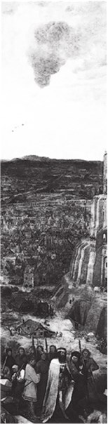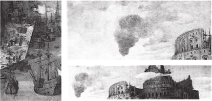 Раз мы что-то представили, оно существует. Вот только где и когда? Но вот Брейгель понял, что вывернутый ад вполне может обозначить свою гигантскую воронку вверх ногами где-нибудь на земле. (Код к этой задачке он оставил, если внимательно вглядеться в изображение, заложив его в форму облака слева от вершины башни, и форма эта воспроизводит как раз воронку «правильного» ада, от которой отталкивается земная, а вернее, надземная башня). И если первый ад был полым, то вывернутый должен быть тяжелым и заполненным. И если там, под землей, наверху были никчемные люди и ангелы, не способные ни на добро, ни на зло, такие все сплошь чеховские персонажи, а внизу ― вмерзший в лед Сатана, то в Вавилонской башне никчемные будут в самом низу, рядом с морем, пристанью и кораблями, там, где плоскость башни распространяется по земле и ее городам, упертым в эту землю и эту плоскость, а Сатана на самой ее вершине – там, где начинается небо с облаками.