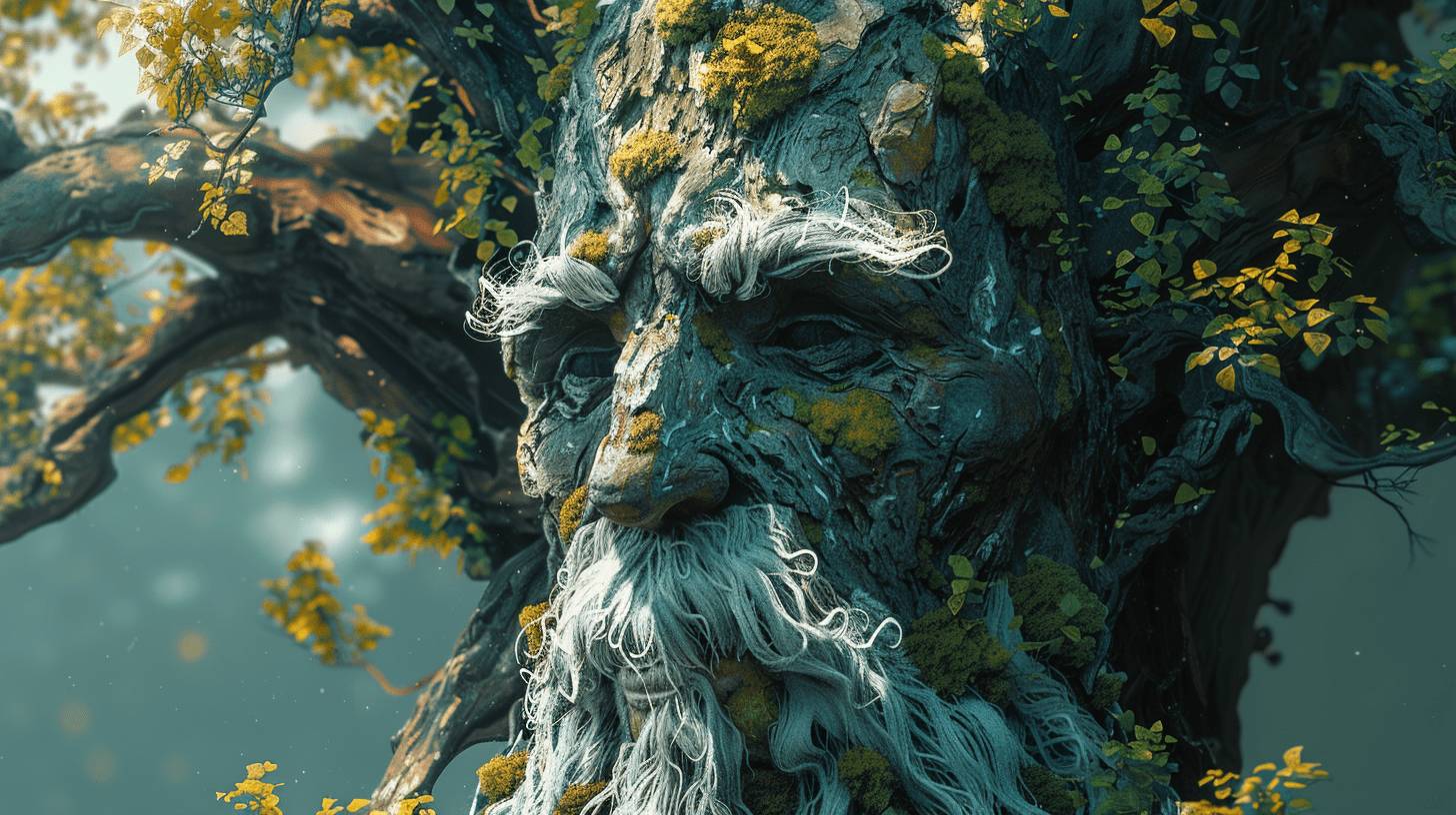 Кот ласково погладил ладонью потрескавшуюся кору на могучем стволе, и девочки заметили, как по древесине пробежала едва заметная дрожь. Внезапно прямо из узловатых наростов дерева выступило сморщенное лицо с внушительной бородой. Это существо почтенно склонило голову перед лазурным котом: