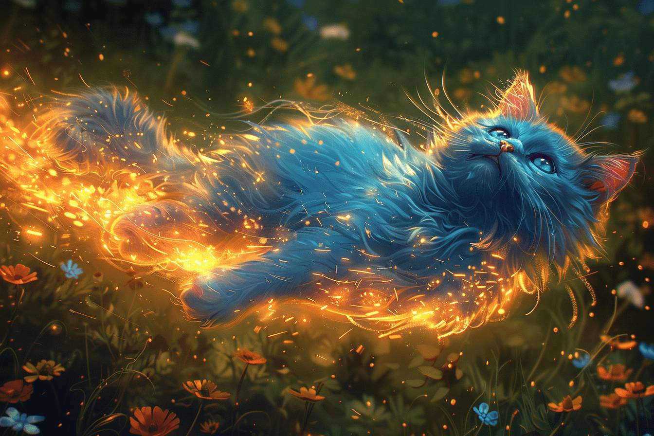 С этими словами волшебный кот совершил невероятный кульбит в воздухе, перевернувшись вокруг своей оси. А затем, приземлившись, тряхнул передними лапками – и за ними потянулся шлейф ярких искорок, брызнувших во все стороны!