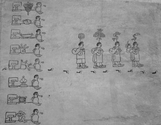 “El caminar”, nehnem(i) para los mexica (aztecas) comparte una raíz lingüística con “vivir”, nem(i)151. Neltiliztli, del nelhuáyotl (significando cimiento o fundación) está relacionado con “pie” (néhuatl). El concepto de “verdad” está basado en estar de pie, en tener una fundación, en tener una base firme152. El glifo de las pisadas, para los mesoamericanos representaba movimiento, identidad, localización, relacionalidad e historia. Los mapas mesoamericanos y sus escritos están llenos de pisadas que indican de dónde vienen y adónde van las gentes. Cuatro pisadas en un círculo señalan un mercado153. El camino largo significaba un proceso y una lucha histórica.