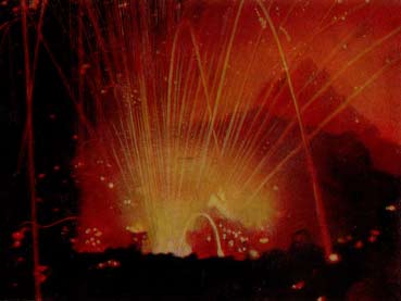 Шаг за шагом продвигался я, прощупывая зыбкую почву; ее куда ярче освещало алое дымное зарево, чем жалкий луч электрического фонарика. Внезапно меня ввергло в оцепенение потрясающее извержение. Да, именно потрясающее, потому что теперь оно было совсем близко! Грохот раздался одновременно с мощной вспышкой света. Верный себе, вулкан выбрасывал лаву в направлении, противоположном моей трассе. Узкий огненный султан озарил южное небо. Затем он угас, и тотчас же посыпались бомбы. Я видел, как по ту сторону жерла падали, мгновенно расплющиваясь, огромные красные комья.