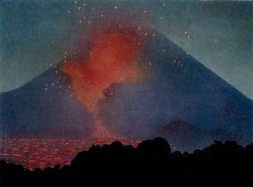 Первая фаза извержения (типа Вулькано). Приблизительная глубина кратера 300 метров. Сгустки, подобные цветной капусте,– раскаленные газы, насыщенные пылью, в них таятся вулканические бомбы